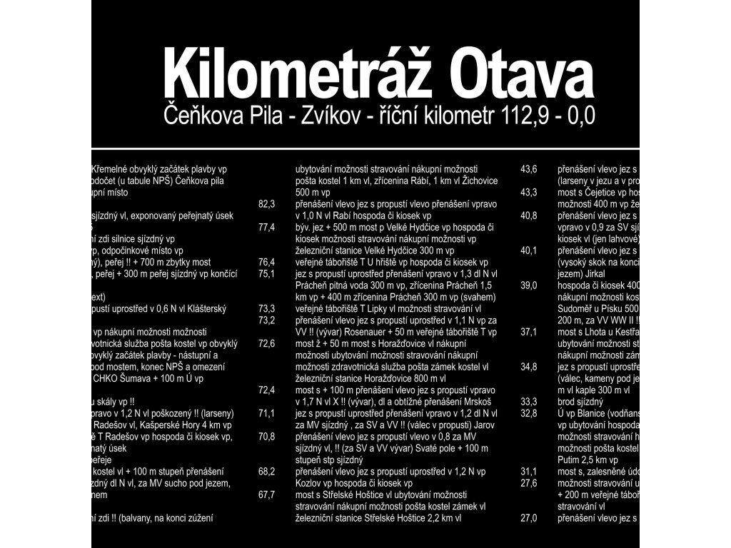 Zatím největší technologický majstrštyk našich tiskařů. Kompletní vodácký itinerář Otavy, z Čeňkárny až na Zvíkov. Jezy, mosty, peřeje, hospody, kempy, památky a možnost nakupování na celé řece. S námi na Otavě nikdy nezabloudíte:)